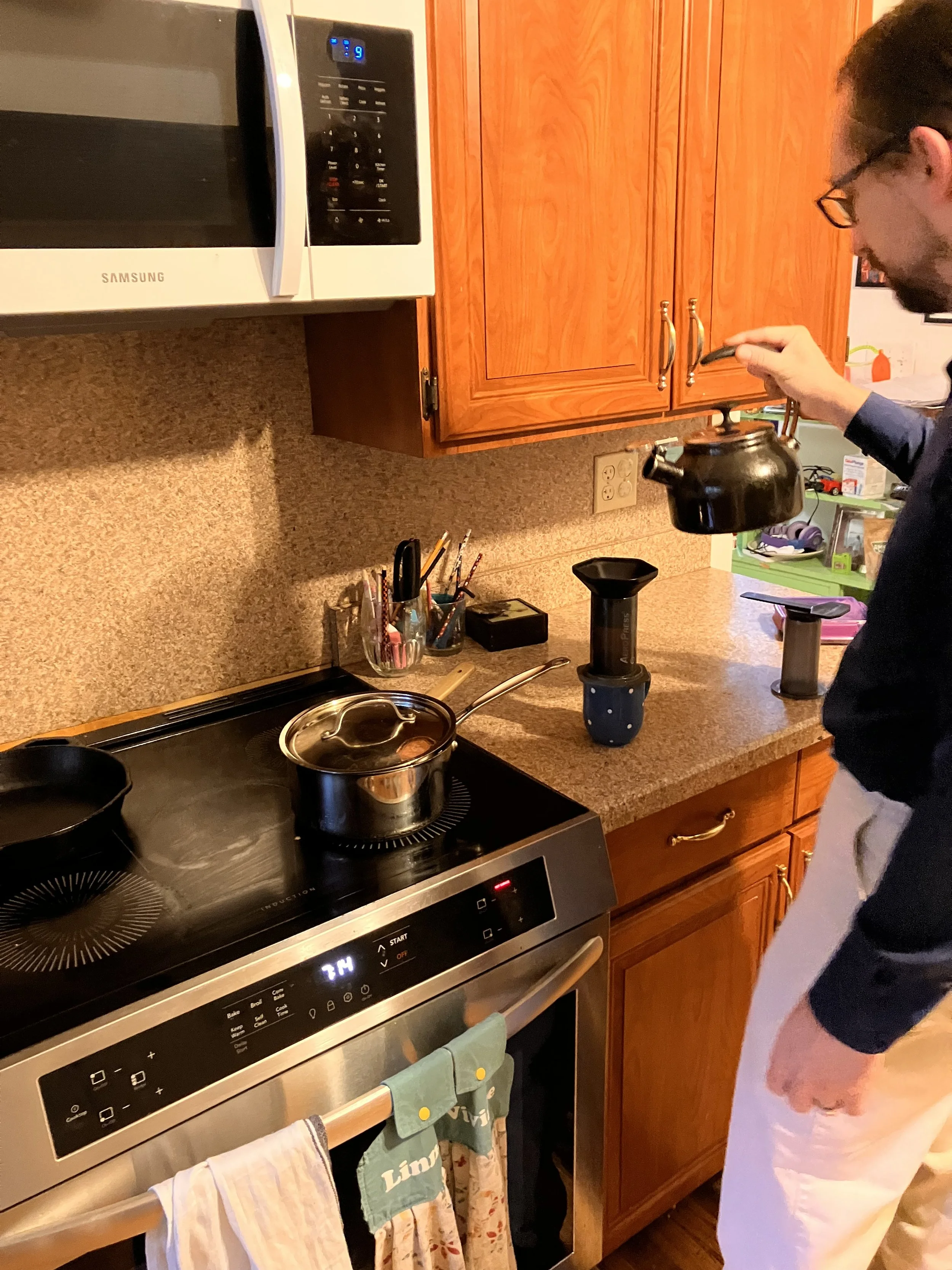 Andrew making coffee on the new LG induction stove sourced from Bray and Scarff